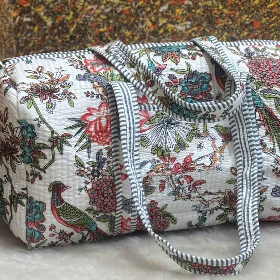 กระเป๋าดัฟเฟิลบล็อกพิมพ์ลายสำหรับซื้อของร้านขายของชำกระเป๋าเดินทางข้ามคืนแบบโบฮีเมียนเดอร์งานควิลท์แฮนด์เมด