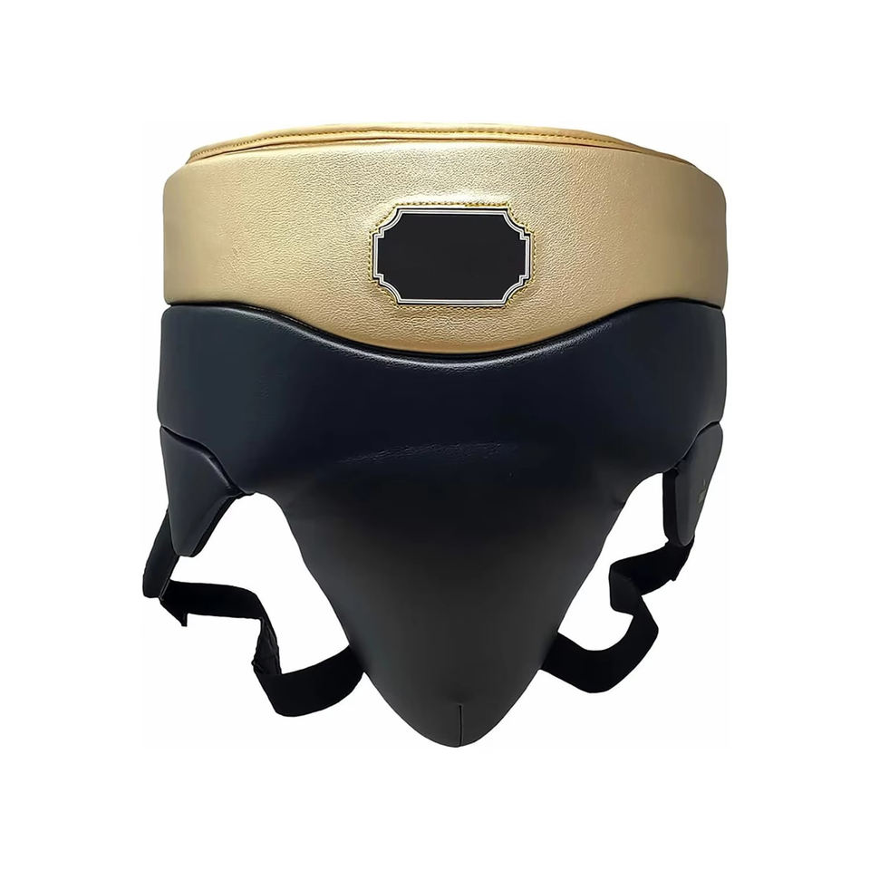 เกราะป้องกันขาหนีบหนังสำหรับผู้ชาย MMA แบบเสริมเกราะป้องกันระบายอากาศได้มีความยืดหยุ่นออกแบบโลโก้ได้ตามต้องการ