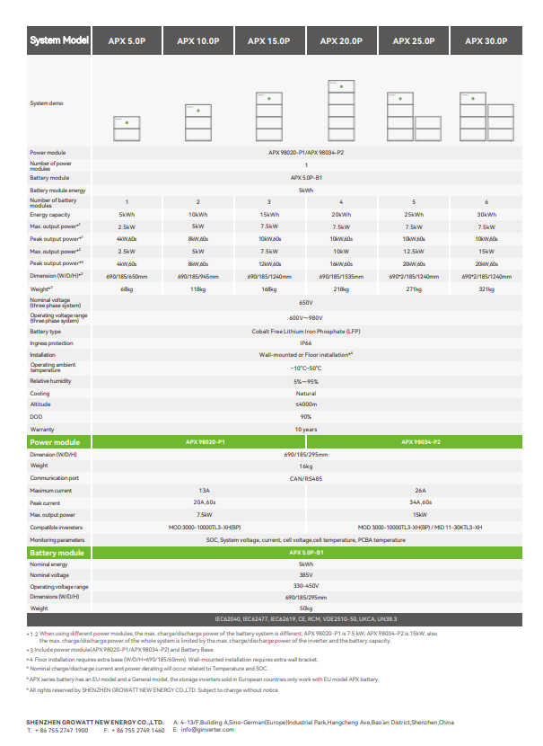 Growatt แบตเตอรี่ LiFePo4ลิเธียมแรงดันสูง HV 330-450V 30KWH APX 30.0P-S1/S2/S0 IP66กลางแจ้ง