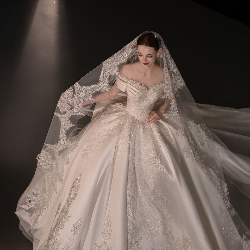 ชุดแต่งงานทรงบอลกาวน์ทันสมัย Gt133 สำหรับเจ้าสาว ดีไซน์หางยาวแบบฝรั่งเศส ตกแต่งด้วยผ้าซาตินคุณภาพสูง งานแฮนด์เมดประณีต พร้อมชายกระโปรงยาวลากพื้น