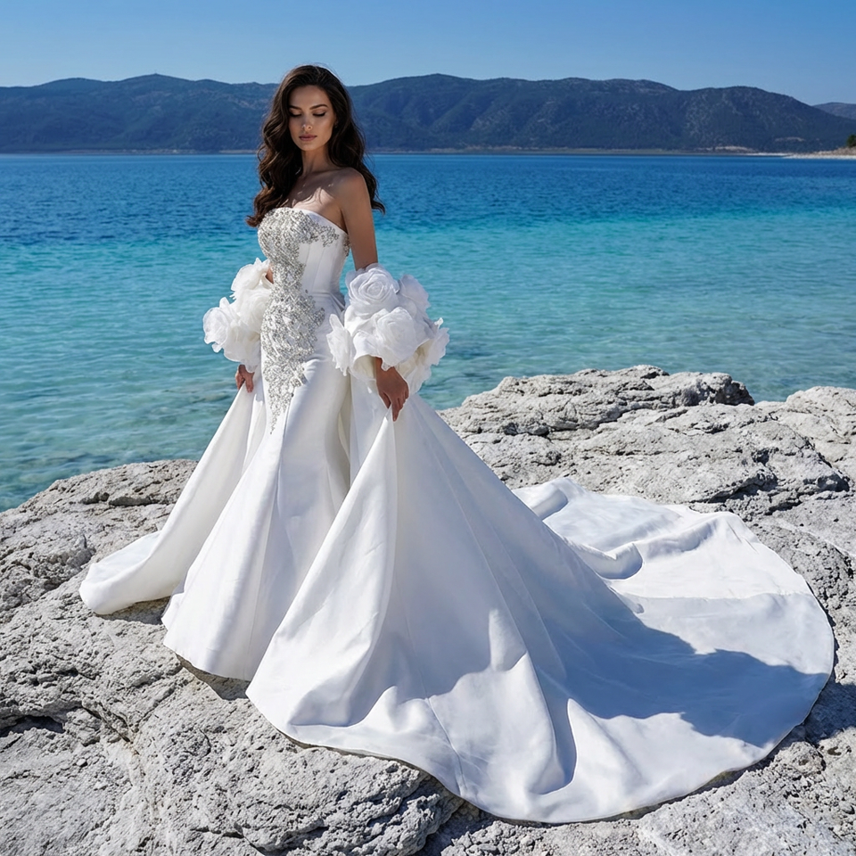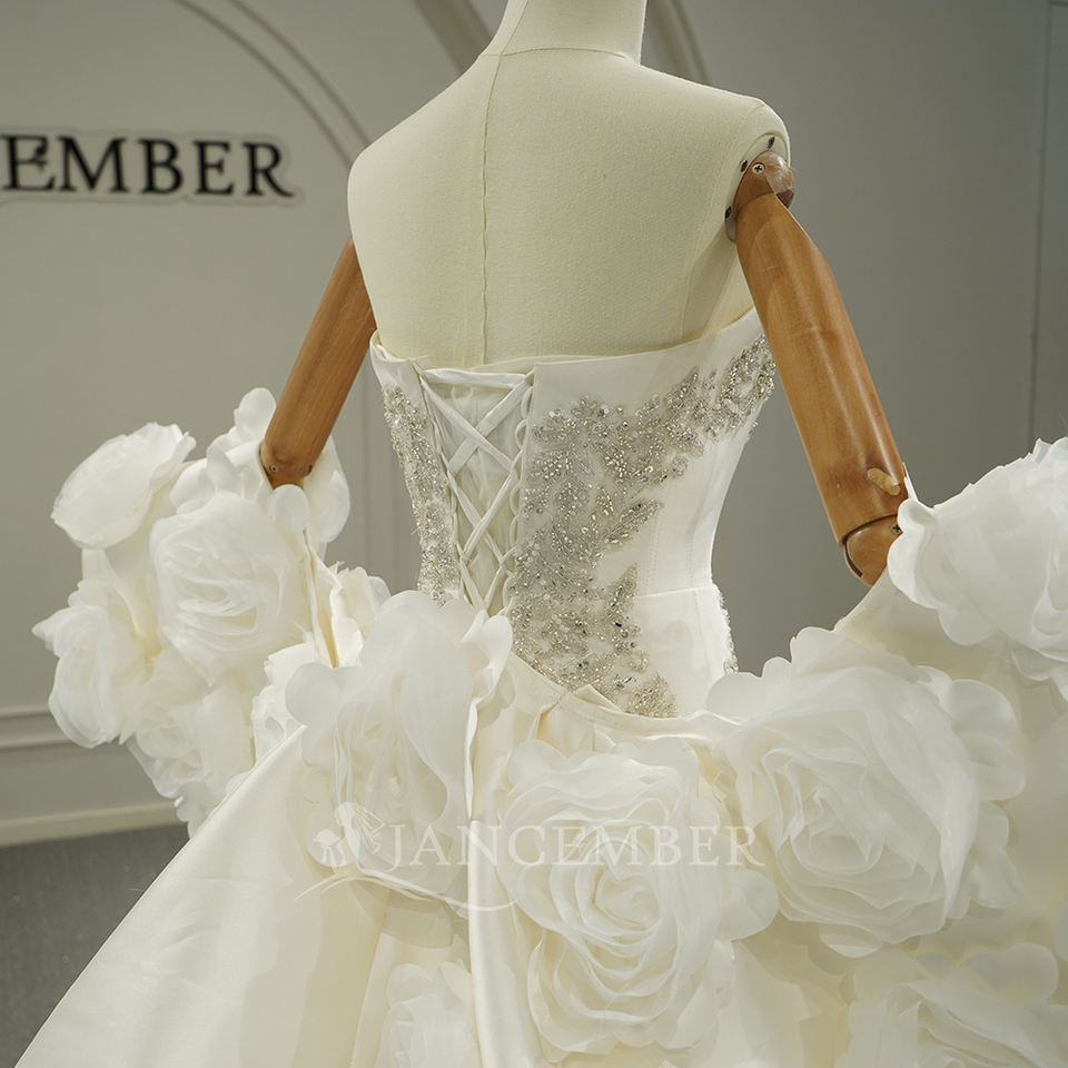 ชุดแต่งงานทรงบอลกาวน์ผ้าซาตินหรูหรา รุ่น Gt26003 คอรูปหัวใจ ยาวลากพื้น ประดับด้วยดอกกุหลาบ 3 มิติ ขนาดใหญ่ ดีไซน์โดดเด่น สามารถถอดออกได้