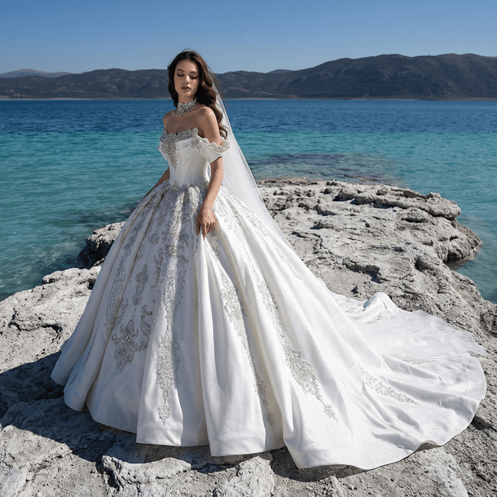 ชุดแต่งงานเจ้าสาวทรงบอลกาวน์ รุ่น GT26015 กระโปรงพอง ผ้าซาตินนุ่ม เรียบหรู สง่างาม ทรงใหญ่ พร้อมชายกระโปรงยาวแบบชาเปล เหมาะสำหรับเจ้าสาวยุคใหม่ ความยาวระดับพื้น