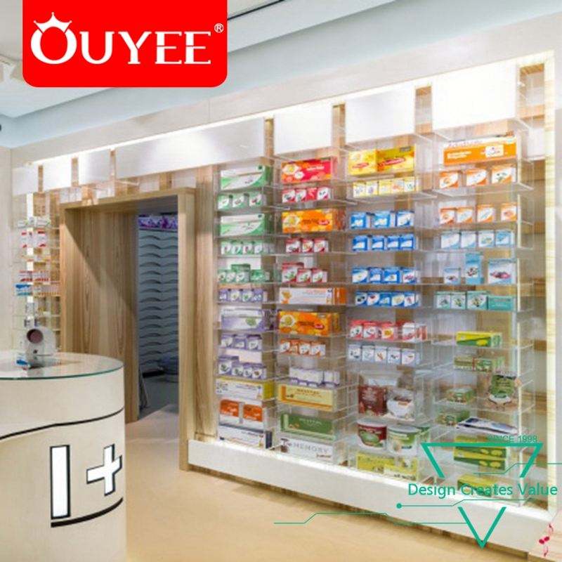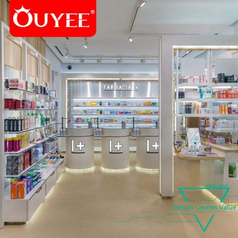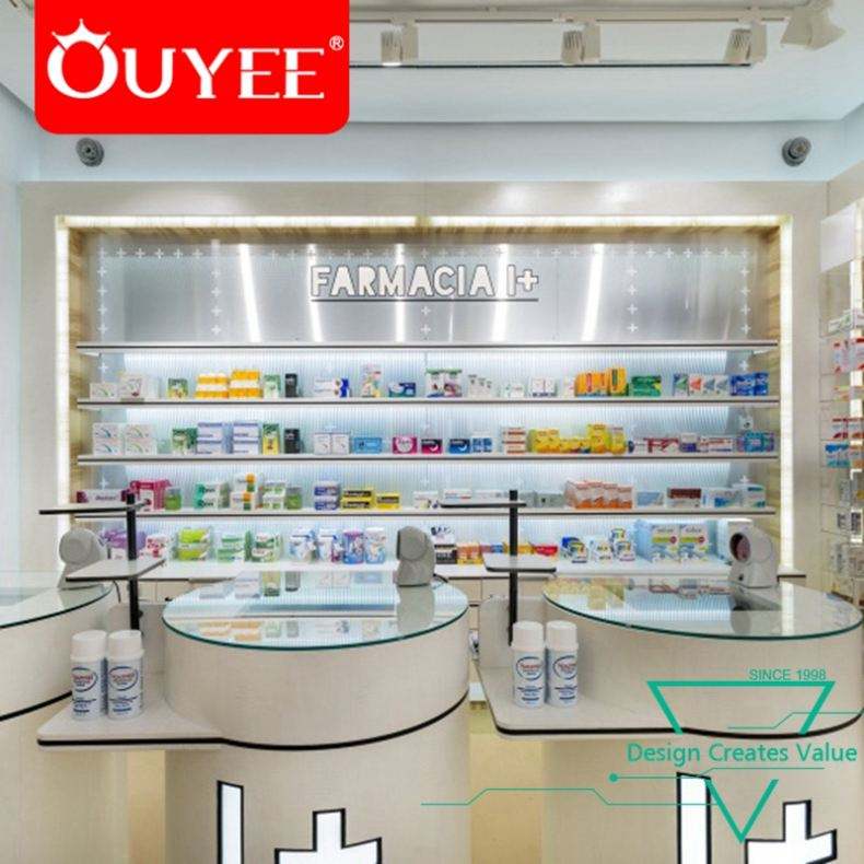 ภาพวาดสีขาวร้านขายยาการออกแบบตกแต่งภายในพร้อมไฟจากผู้ผลิตกวางโจว