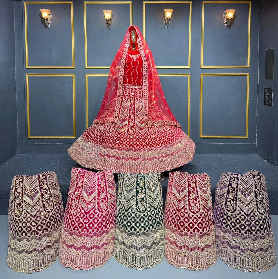 ชุดเลเฮนกาโชลีกำมะหยี่สำหรับเจ้าสาว งานปักประณีต ยาวถึงพื้น ไม่ยับ มีหกสี สำหรับงานพิธีกรรมแบบดั้งเดิม