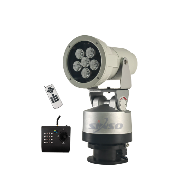 ไฟส่องสว่างแบบซีนอนสำหรับคลังสินค้า กำลังไฟสูง 150 วัตต์ 1800 วัตต์ ควบคุมแบบไร้สาย ตัวเครื่องทำจากอลูมิเนียมอัลลอยด์ มาตรฐานกันน้ำกันฝุ่น IP65 สำหรับการลาดตระเวนอัตโนมัติในหอเฝ้าระวัง