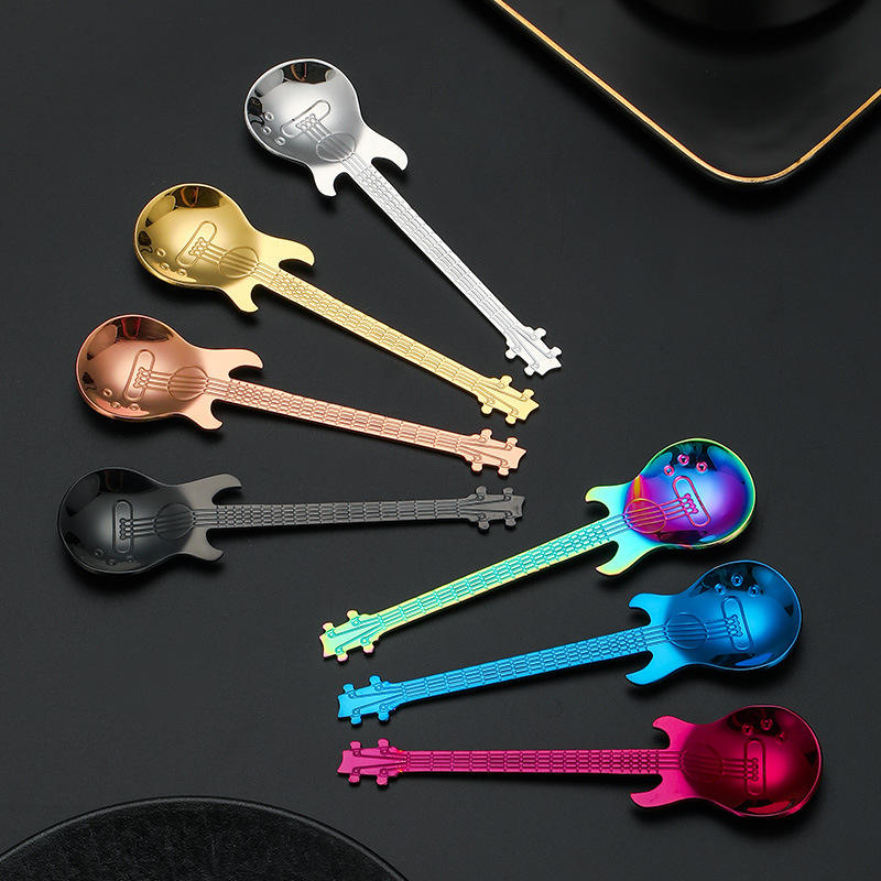 ช้อนกีตาร์ สแตนเลส 304 ช้อนขนมหวานขนาดเล็ก ช้อนบาร์ดนตรี สำหรับเค้ก ไอศกรีม สีเงิน สีทอง สีโรสโกลด์ สีฟ้า สีม่วง