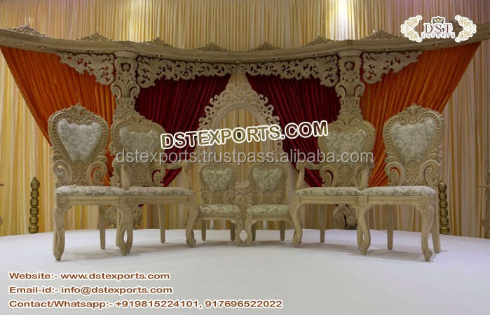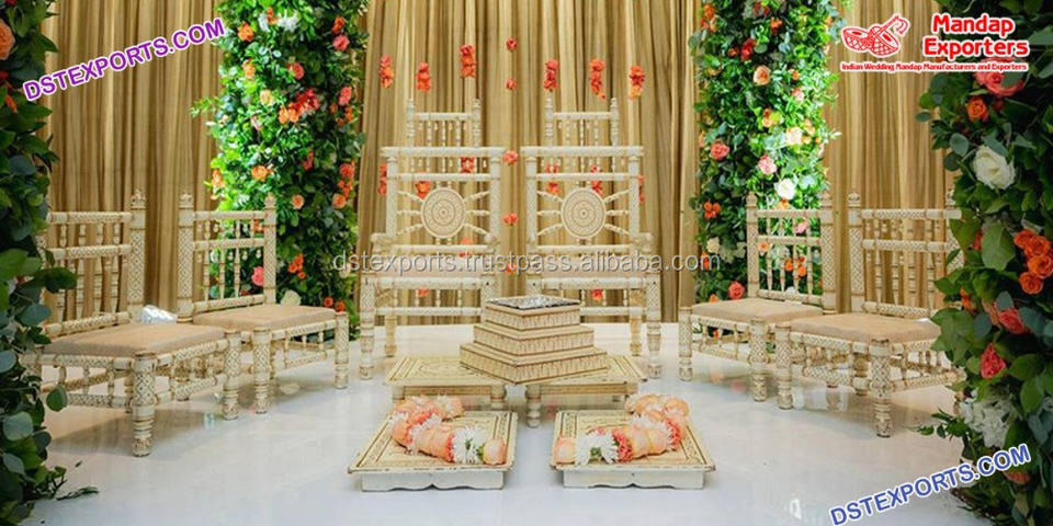 Gujarati ชุดเก้าอี้งานแต่งสีทองสำหรับงานแต่งงานเก้าอี้ไม้ Mandap แกะสลักออกแบบใหม่สำหรับงานแต่งงาน