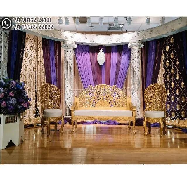ชุดโซฟาแต่งงานแบบแกะสลักลายดอกไม้สไตล์กูจารัต ชุดโซฟาสำหรับงานแต่งงานแบบอินเดียดั้งเดิม โซฟาสำหรับเวทีงานแต่งงานสีทองหรูหรา สไตล์อเมริกัน