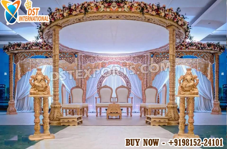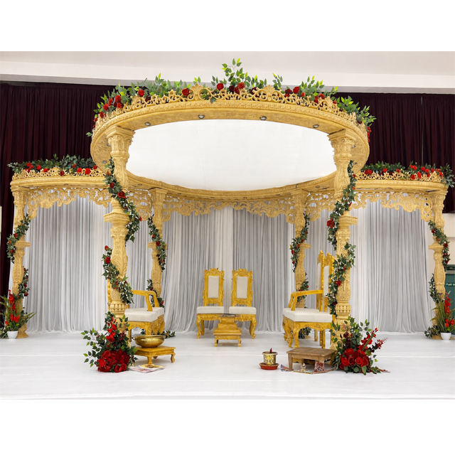 ไอเดียสำหรับงานแต่งงานแบบกูจาราติในสหรัฐอเมริกา ซุ้มแต่งงานไม้แกะสลักสีทองรุ่นล่าสุด ขายส่งซุ้มแต่งงานตกแต่งดอกไม้สไตล์อังกฤษ