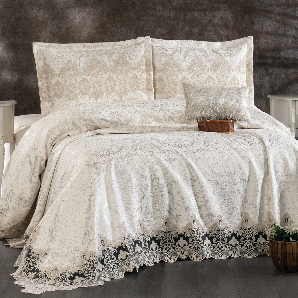 ชุดเครื่องนอนเจ้าสาวสุดหรู 4 ชิ้น รุ่น Guzide MAVERA ผ้าถักออร์แกนิค ลายทันสมัย ดีไซน์เฉพาะตัว สีเอครู/ทอง ผลิตจากผ้าเชนิล