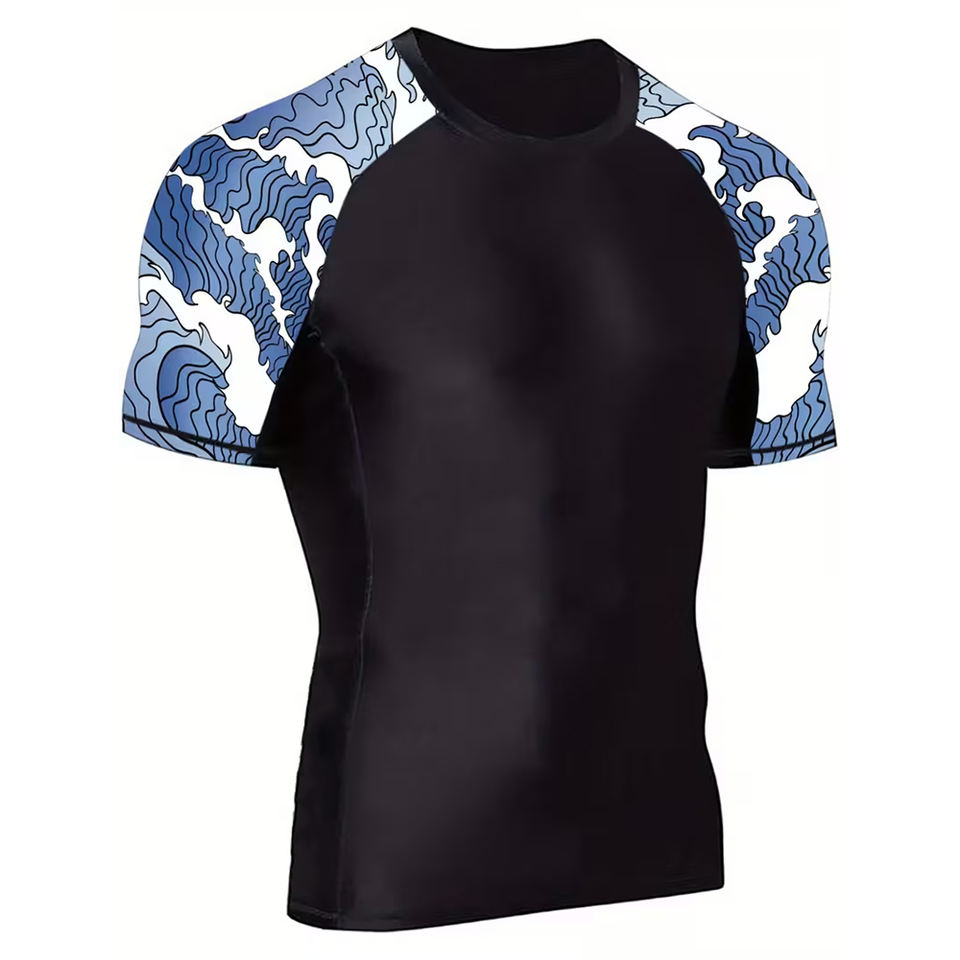 MMA ชุดฝึกต่อสู้สำหรับผู้ชายชุดป้องกันผื่นคันมีแขนพิมพ์ลายการระเหิดสำหรับยิมฟิตเนส
