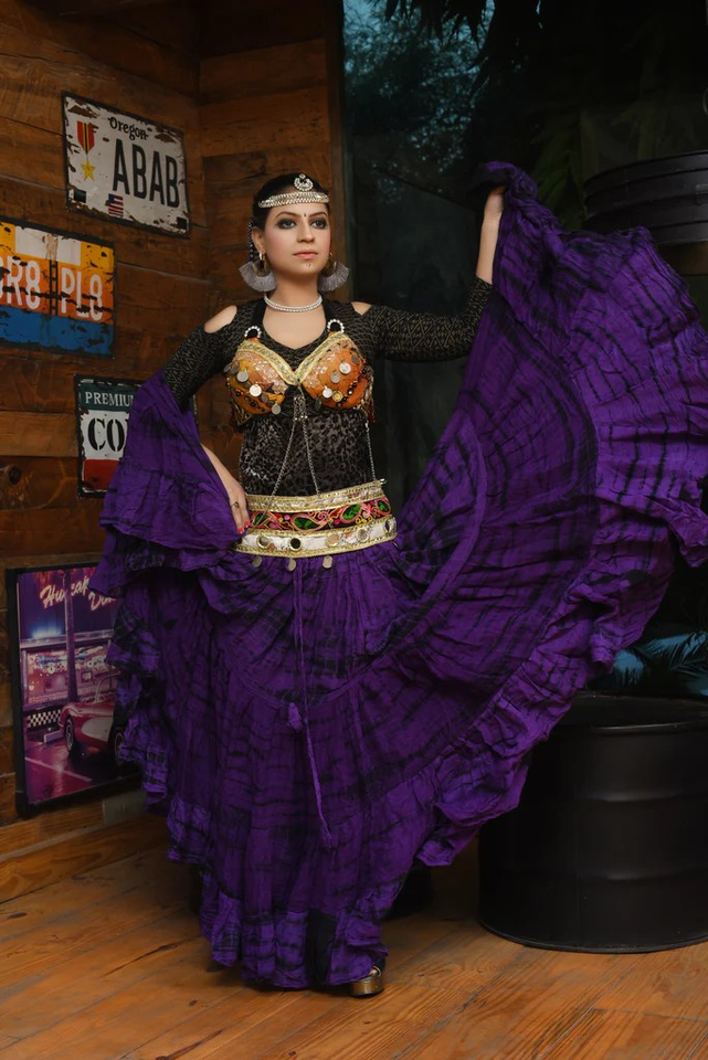 ชุดเต้นรำชนเผ่ายิปซีแบบผสมผสาน ประดับกระจกหลากสี ชุดโชลีสีม่วง กระโปรงบาน พร้อมเครื่องประดับแบบดั้งเดิม