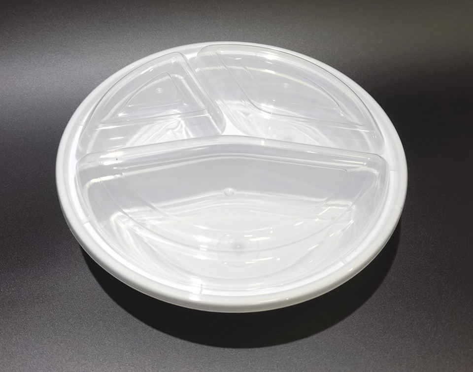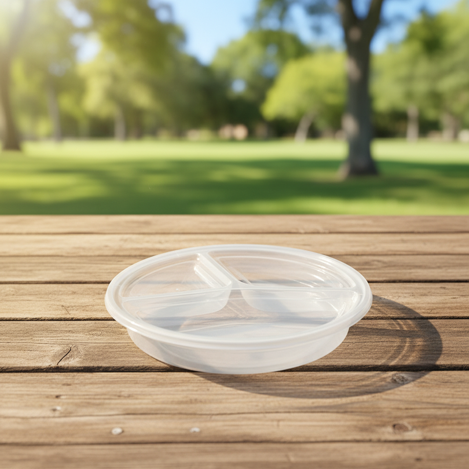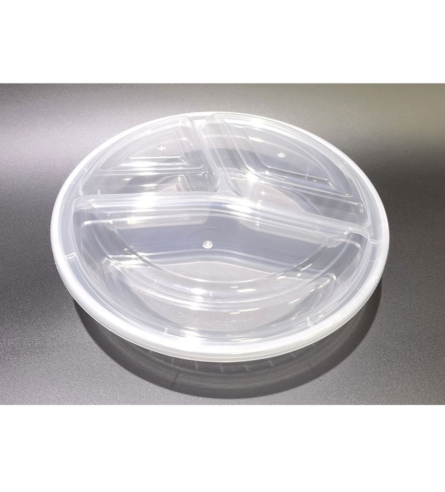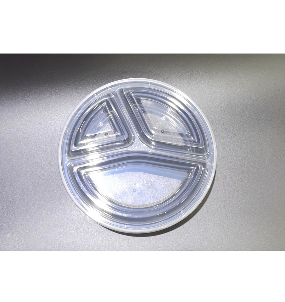 กล่องพลาสติก PP ทรงกลมแบบใช้แล้วทิ้ง 3 ช่อง ยี่ห้อ HACAMY สำหรับบรรจุอาหาร พร้อมฝาปิด เหมาะสำหรับงานจัดเลี้ยงเชิงพาณิชย์