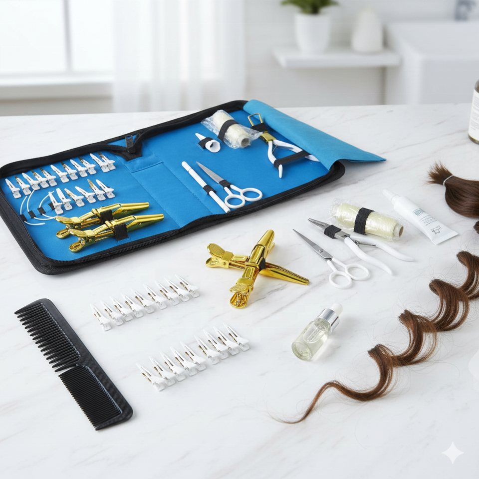 ชุดอุปกรณ์ทำผมมืออาชีพ ชุดอุปกรณ์ต่อผมสแตนเลส พร้อมกรรไกรพลาสม่าสีน้ำเงิน โลโก้พิมพ์ลาย คีมตัดเทปแบบกำหนดเอง