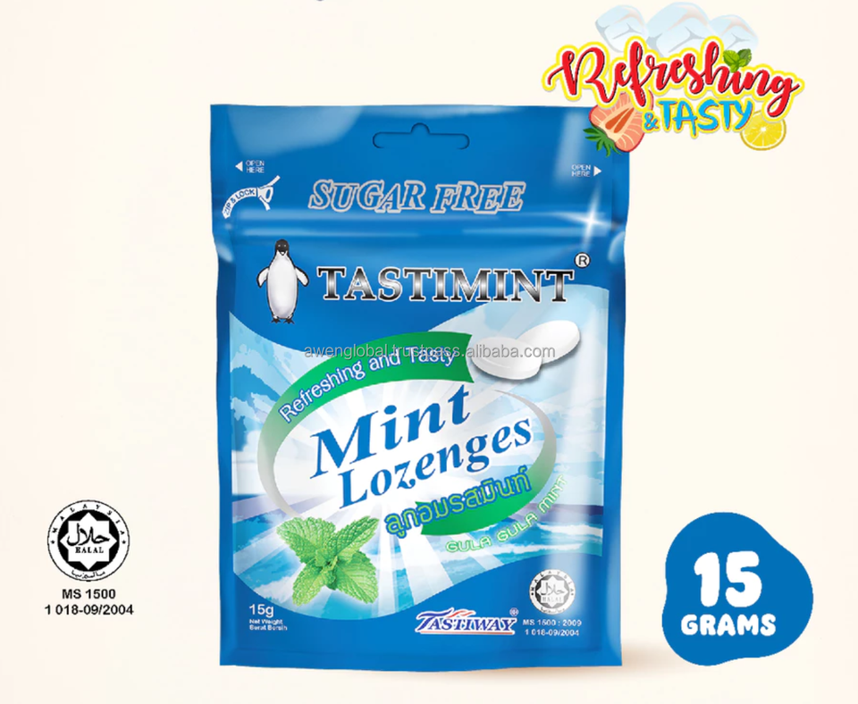 ลูกอมฮาลาล รสเลมอนมิ้นต์ ปราศจากน้ำตาล บรรจุในซองซิปล็อค รสชาติอร่อยสดชื่น อายุการเก็บรักษา 24 เดือน