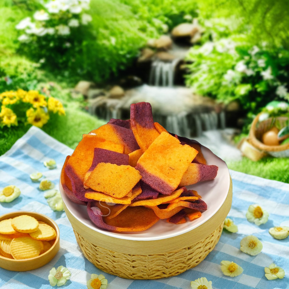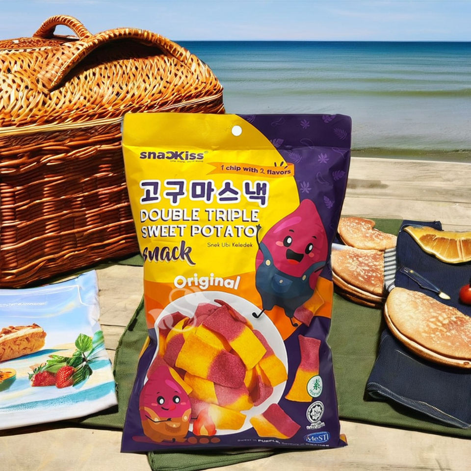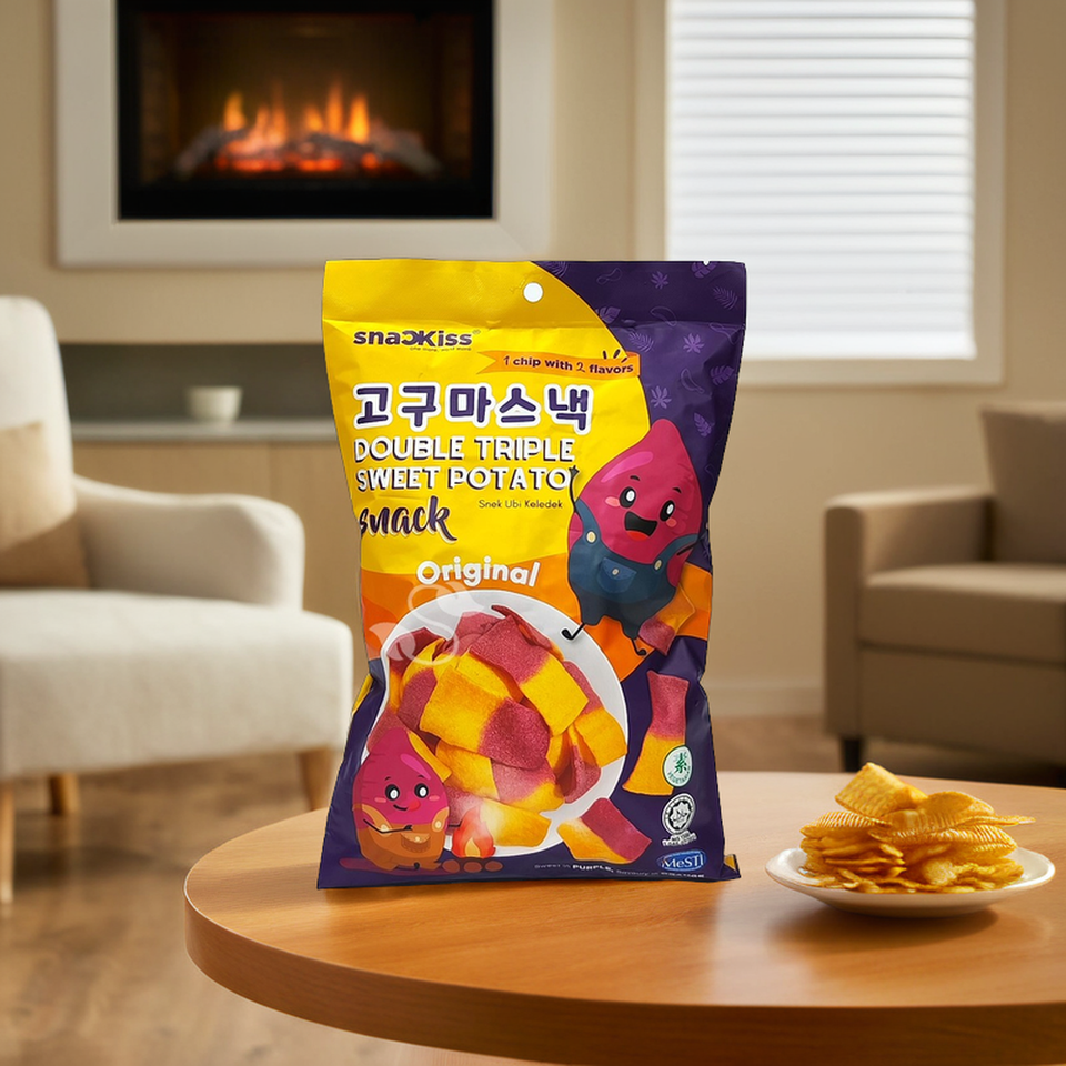 มันเทศฮาลาลวีแกนและฟักทองผสมผสานเป็นชิปผักกรอบกึ่งนิ่มพร้อมรับประทาน อายุการเก็บรักษา 12 เดือน ผลิตในมาเลเซีย
