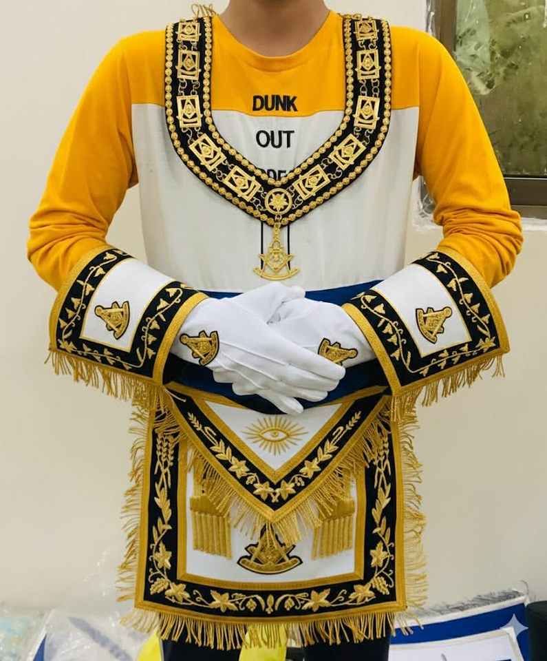 ผ้ากันเปื้อน ปลอกแขน ปลอกคอ และถุงมือ ปักมือ ลายมasonic สำหรับผู้ได้รับการยกย่องเป็นอดีตมาสเตอร์ สีดำ HSE