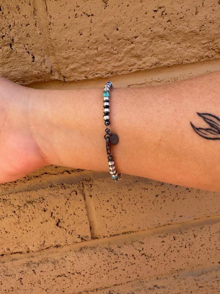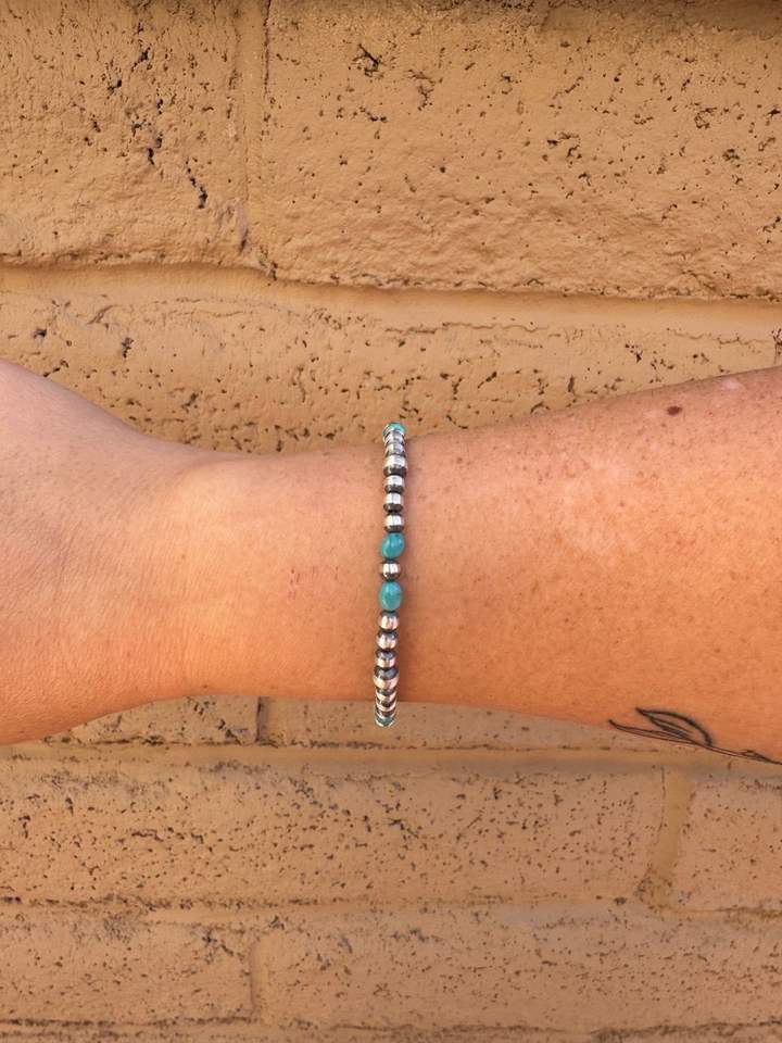สร้อยข้อมือประดับมุกเทอร์ควอยซ์และเงินสเตอร์ลิงทำมือ ขนาด 4-5 มม. ความยาว 7.5 นิ้ว