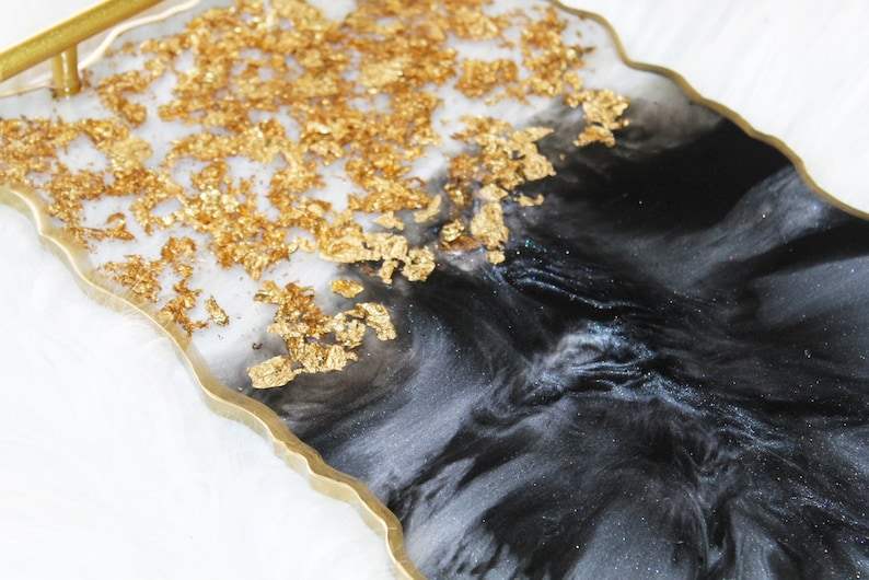 ถาดรองแก้วเรซิ่นหินอ่อนสีดำขาวขนาดใหญ่สุดหรู งานฝีมือประณีต ดีไซน์มินิมอล ตกแต่งด้วยการเพ้นท์มือ พร้อมหูจับสีทอง