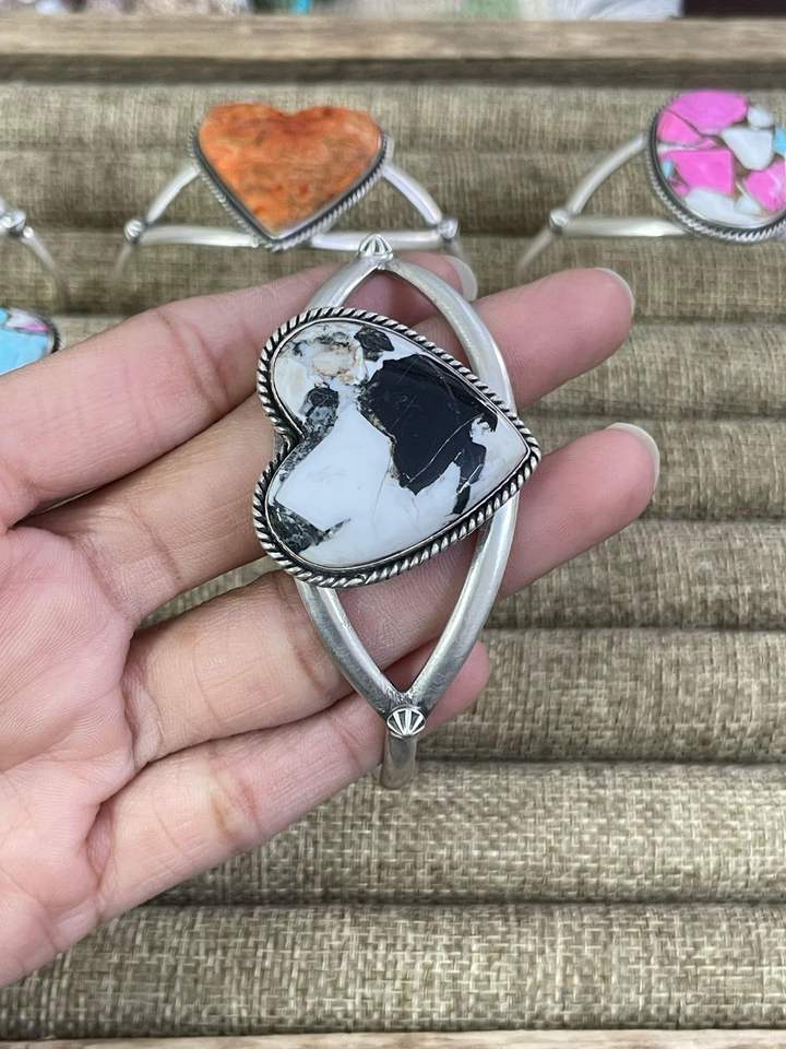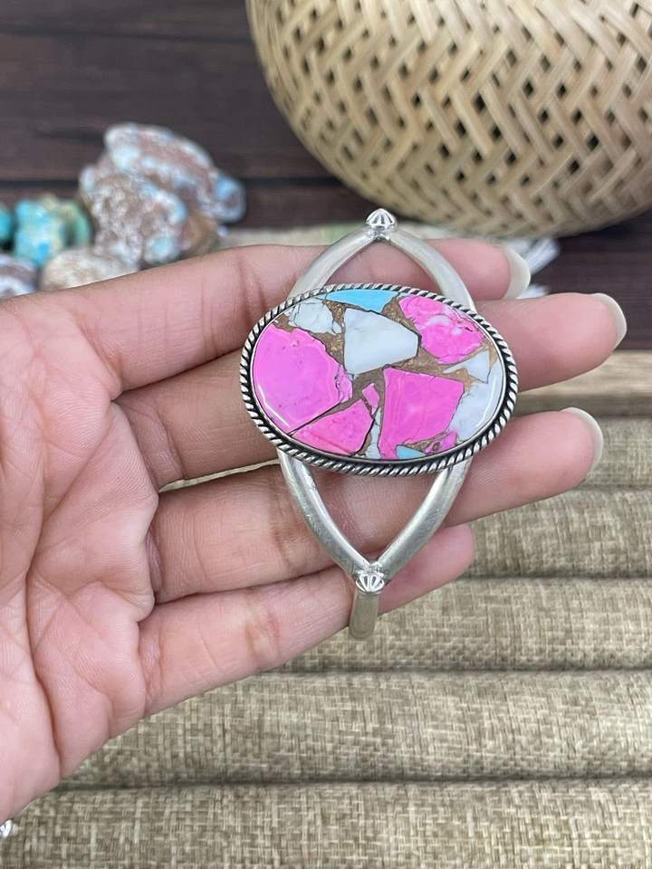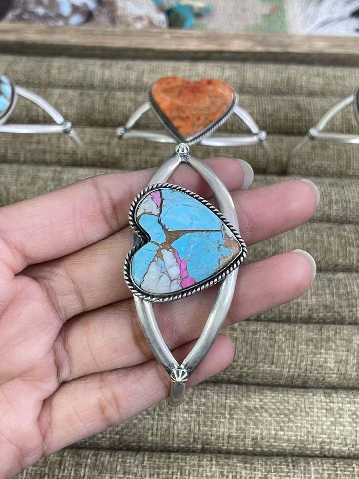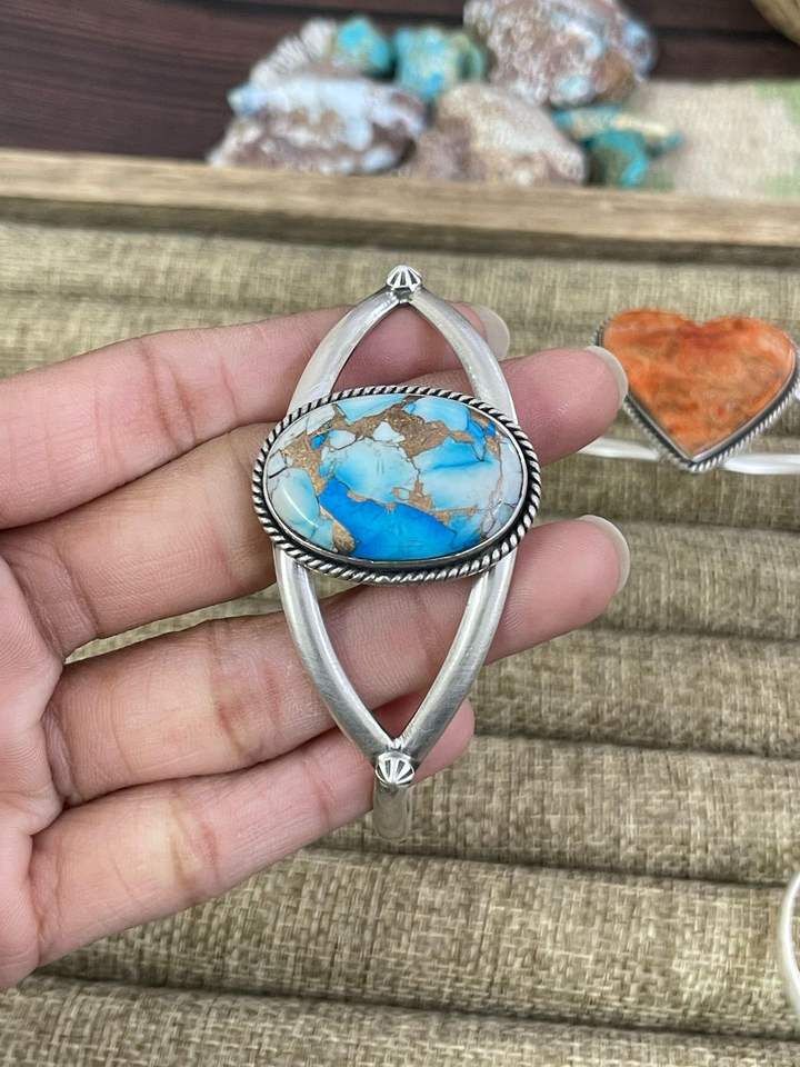 สร้อยข้อมือเงินแท้ทำมือ ประดับด้วยสีทอง สีฟ้าโมฮาเว่ สีขาวคอตตอนแคนดี้ และสีส้มโมฮาเว่