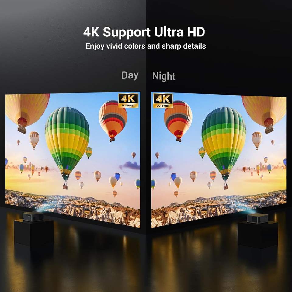 โปรเจคเตอร์โฮมเธียเตอร์ HAPPRUN 4K พร้อมเลนส์โฟกัสอัตโนมัติ WiFi 6 และบลูทูธ 5.2 ฉายภาพยนตร์ได้ขนาด 300 นิ้ว สำหรับใช้ในบ้าน ปลั๊กแบบอเมริกา