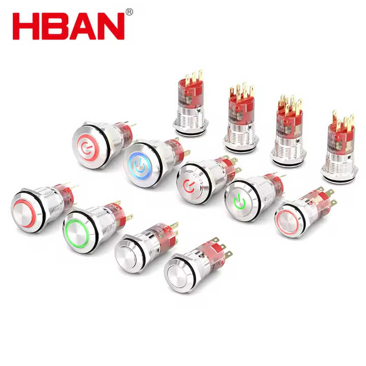 สวิตช์กดแบบกดติดปล่อยดับ HBAN สีเขียว ไฟ LED ส่องสว่าง ตัวเรือนโลหะ ขนาด 22 มม. 220 โวลต์ ขั้วต่อแบบขาเสียบ ปกติเปิด แบบกดติดปล่อยดับ IP67