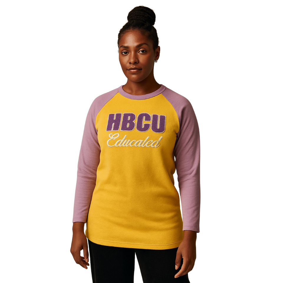 Hbcu เสื้อยืดแขนยาว Raglan การศึกษาเสื้อยืดผ้าฝ้ายปักกำมะหยี่สีทองเสื้อสโมสรสโมสรสตรีกรีก