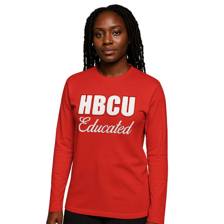เสื้อยืดแขนยาวสีแดง HBCU สำหรับผู้รับการศึกษาที่มหาวิทยาลัยสีแดง 100% ผ้าฝ้ายปักลายเชนิลล์ ชมรมพี่น้องกรีก Delta Divine Nine แฟชั่นเสื้อยืดสไตล์นักศึกษา