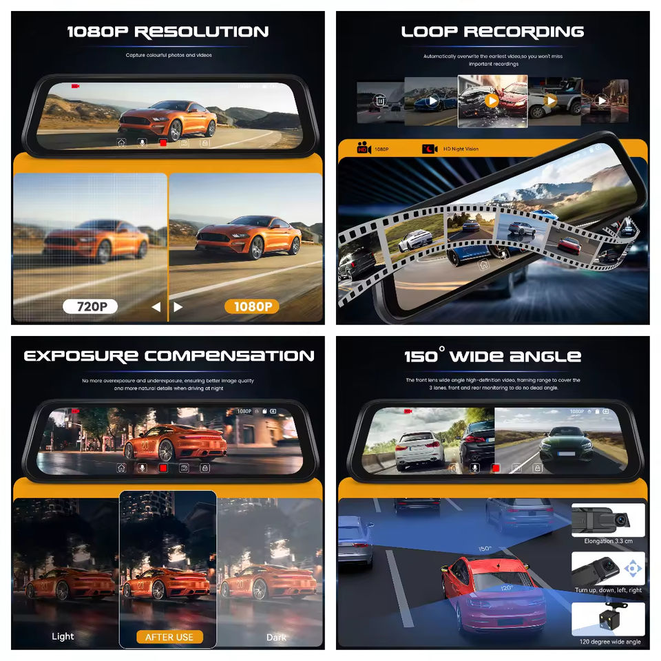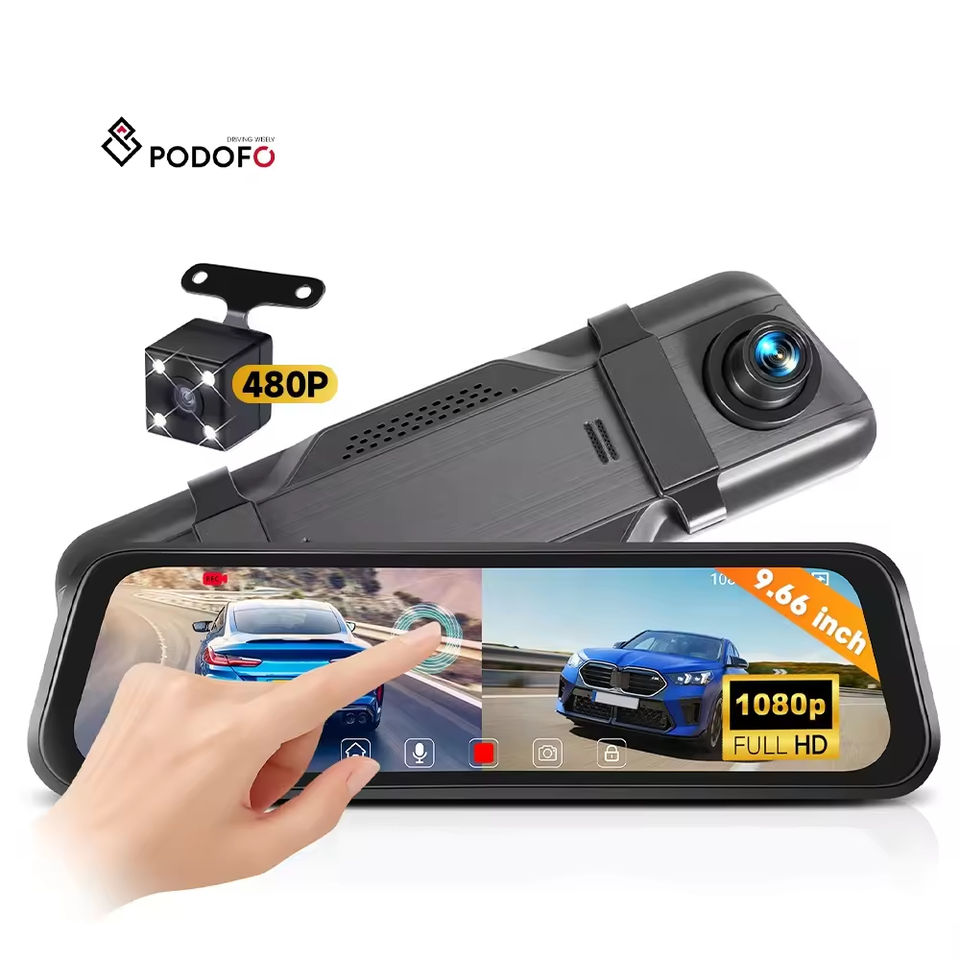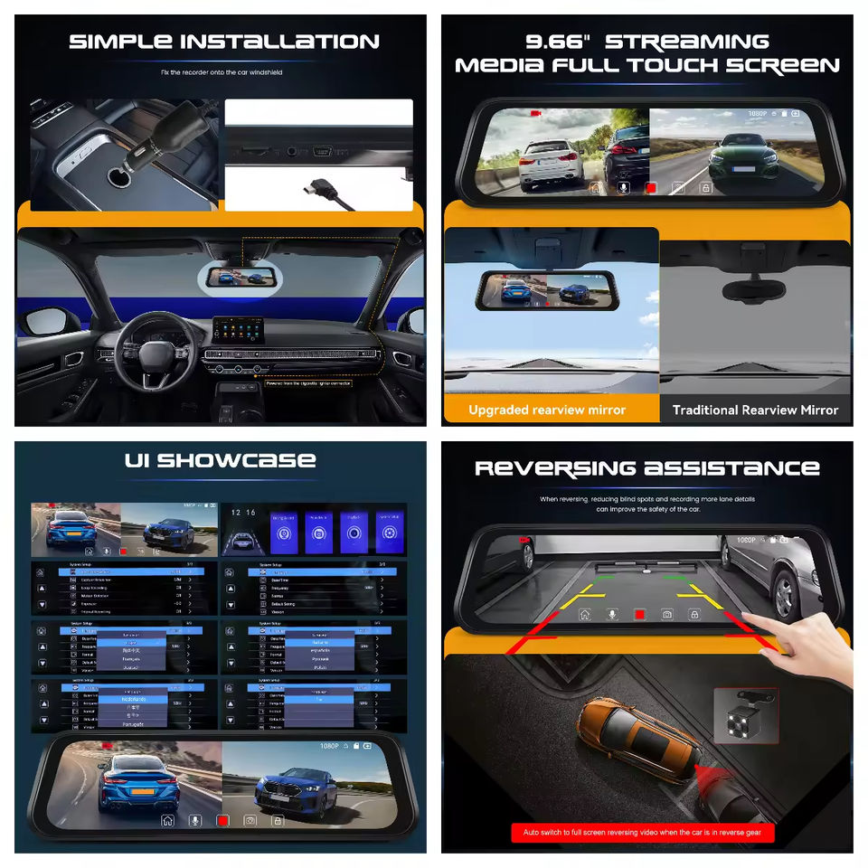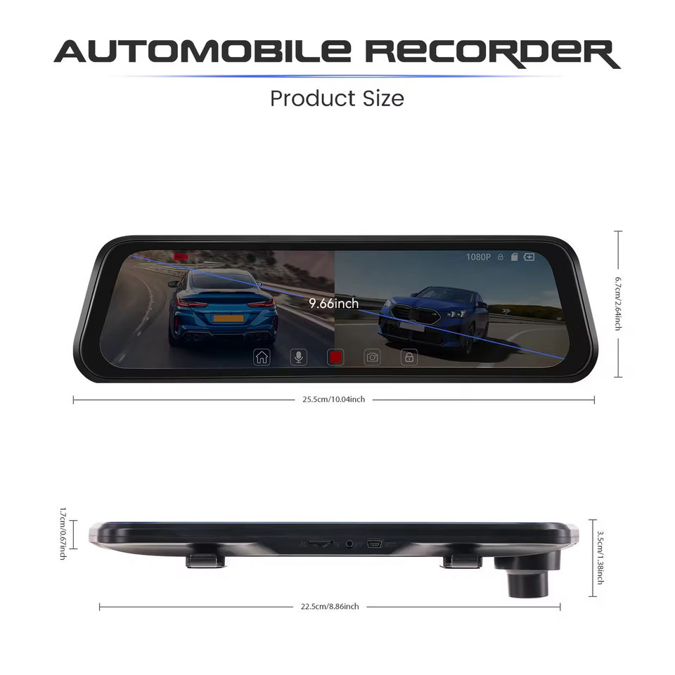 กล้องติดรถยนต์ HD แบบเลนส์คู่ หน้าจอสัมผัส IPS ขนาด 9.66 นิ้ว บันทึกแบบวนซ้ำ มองเห็นในเวลากลางคืน พร้อมระบบตรวจจับการจอด