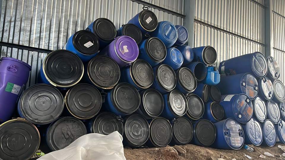 เศษถัง HDPE และผง/เกล็ดพลาสติกสีน้ำเงินสำหรับรีไซเคิลหรือส่งออก ยี่ห้อ E$T รุ่น 008/3813 แอฟริกาใต้