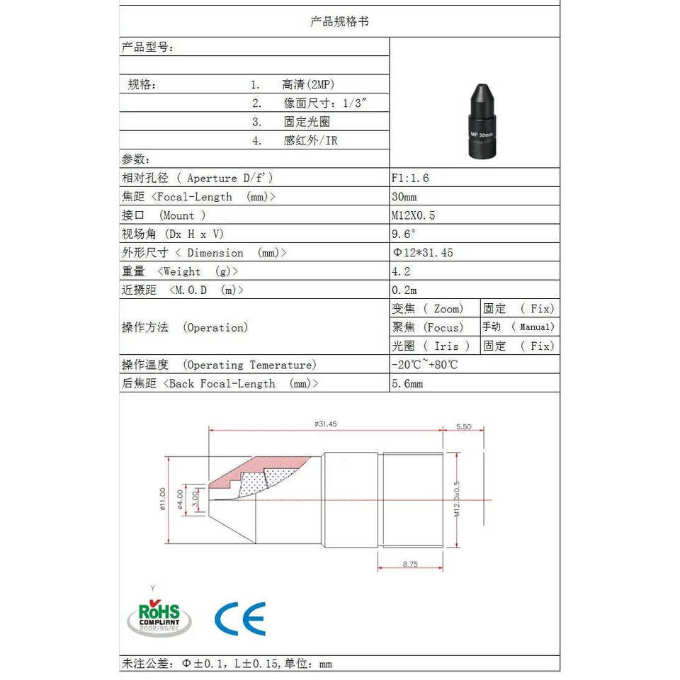 Hdvscope เซ็นเซอร์ CCD 2MP 1/3, 30mm hfov อินเตอร์เฟซ12องศา M12 * 0.5มม. F18 IRCUT 940 850ตัวกรอง650nm รูเข็ม CCTV แบบคงที่