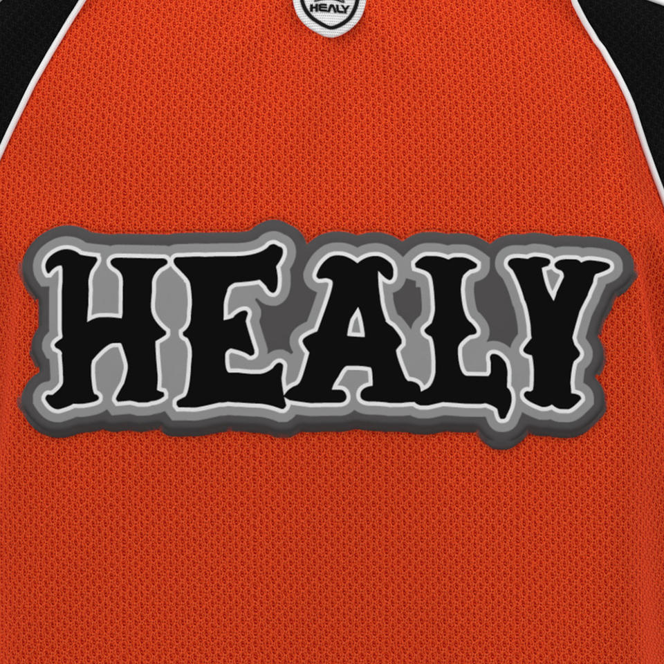 เสื้อเจอร์ซีย์ตาข่ายสไตล์อเมริกันสีส้มดำตัดกัน แบรนด์ HEALY แขนสั้น คอวี ระบายอากาศได้ดี น้ำหนักเบา เหมาะสำหรับใส่เล่นฟุตบอลและสตรีทแวร์