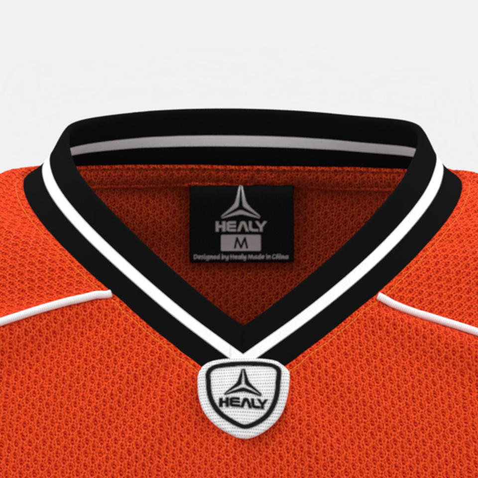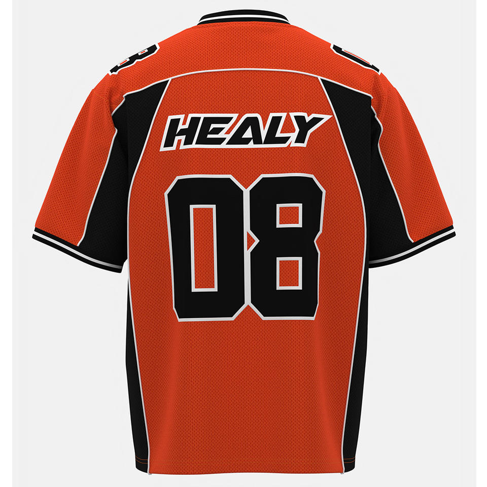 เสื้อยืดแขนสั้นผู้ชาย HEALY สีส้มดำตัดกัน ลายพิมพ์อเมริกัน ผ้าตาข่าย ระบายอากาศ แห้งเร็ว น้ำหนักเบา คอวี สไตล์สตรีทแวร์