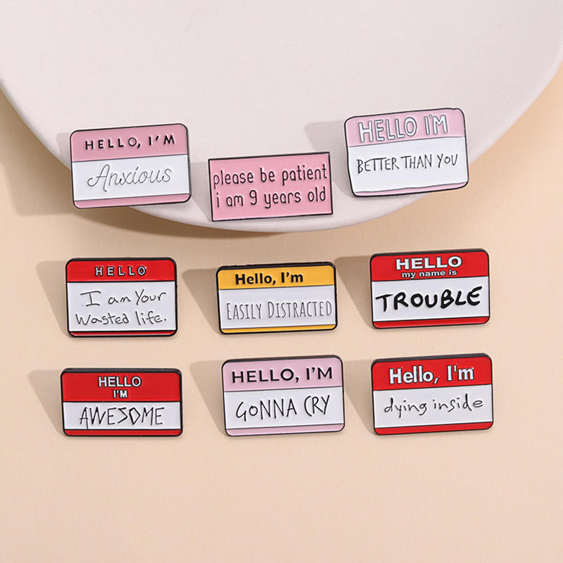 สวัสดีหมุดเคลือบที่ยอดเยี่ยมที่กำหนดเองชื่อของฉันคือปัญหาดีกว่าที่คุณเข็มกลัดป้ายปกเสื้อป้ายข้อความตลกกล่องโต้ตอบเครื่องประดับสโลแกน