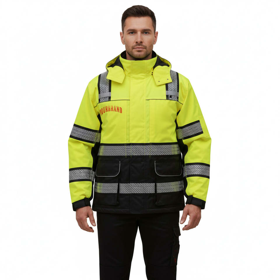 เสื้อแจ็คเก็ตนิรภัยสะท้อนแสงแบบกันน้ำ ไฟ LED ANSI Class 2 ผลิตจากโพลีเอสเตอร์ 100% พร้อมโลโก้สั่งทำพิเศษ สำหรับผู้ชาย ใส่ทำงานกลางแจ้ง