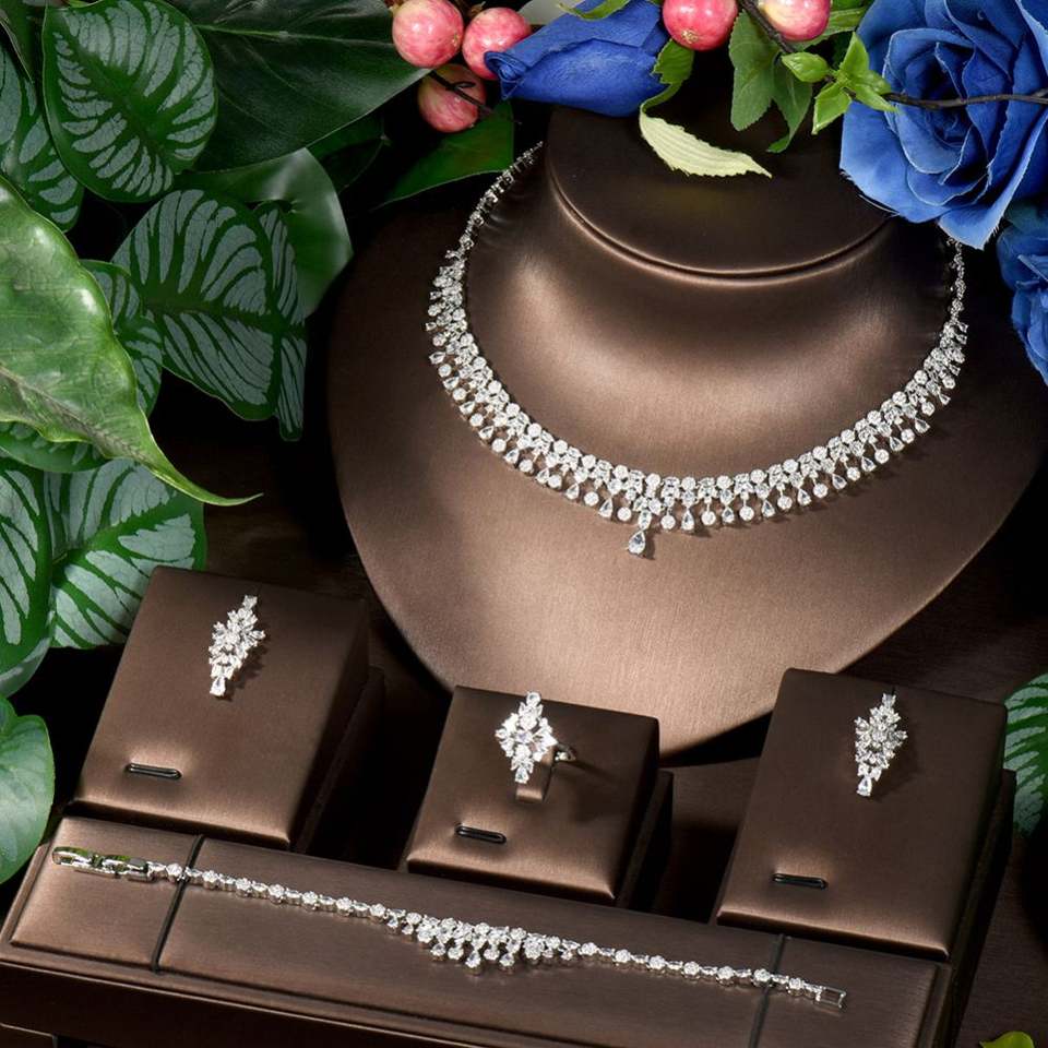 Hibide ชุดสร้อยคอและต่างหูเพทายทรงลูกบาศก์ AAA 4ชิ้นสำหรับงานแต่งงานของผู้หญิงเครื่องประดับ N-64