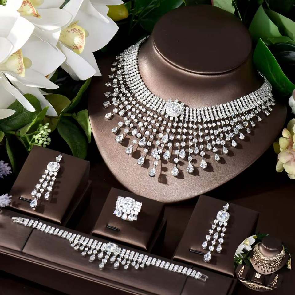 Hibide ชุดเครื่องประดับหยดน้ำขนาดใหญ่สำหรับงานแต่งงานของเจ้าสาวชุดต่างหูพู่ยาว4ชิ้นและสร้อยคอ N-71 Bioux