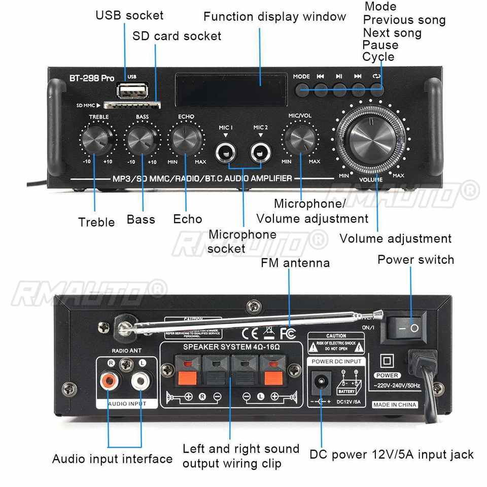 เครื่องขยายเสียงไฮไฟ 2.0 ช่องดิจิตอลบลูทูธเครื่องขยายเสียง 12V 240V รองรับบลูทูธ USB SD วิทยุพร้อมรีโมทคอนโทรล EU