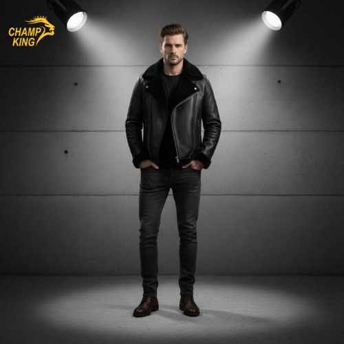 แจ็คเก็ตหนังคุณภาพสูงสำหรับผู้ชาย หนังวัวแท้ ซับในขนเทียม ปกเสื้อแบบมีขน รุ่นปี 2025