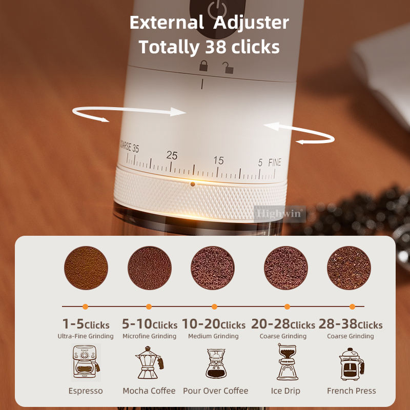 Highwin เครื่องบดกาแฟแบบชาร์จไฟได้ USB ปรับภายนอก38คลิกเครื่องบดเมล็ดกาแฟไฟฟ้าแบบพกพา