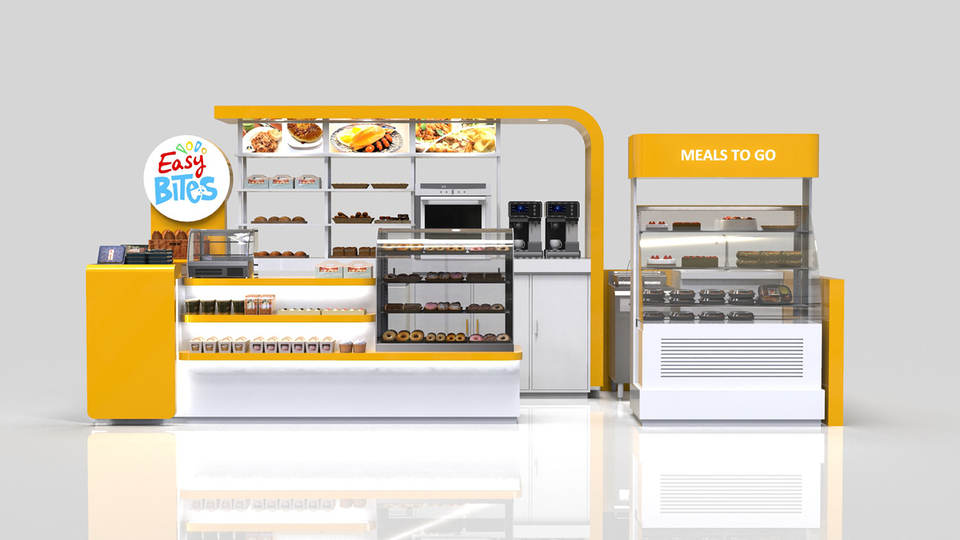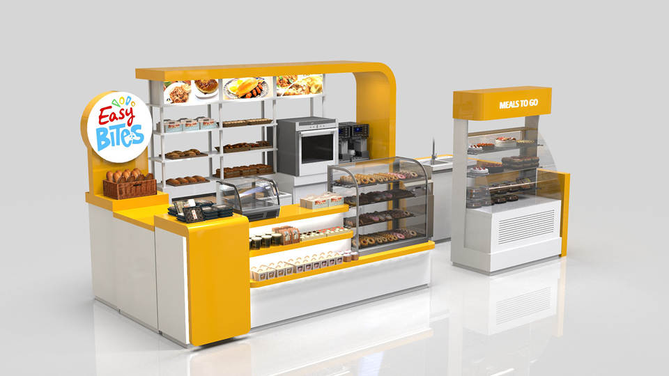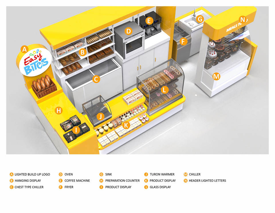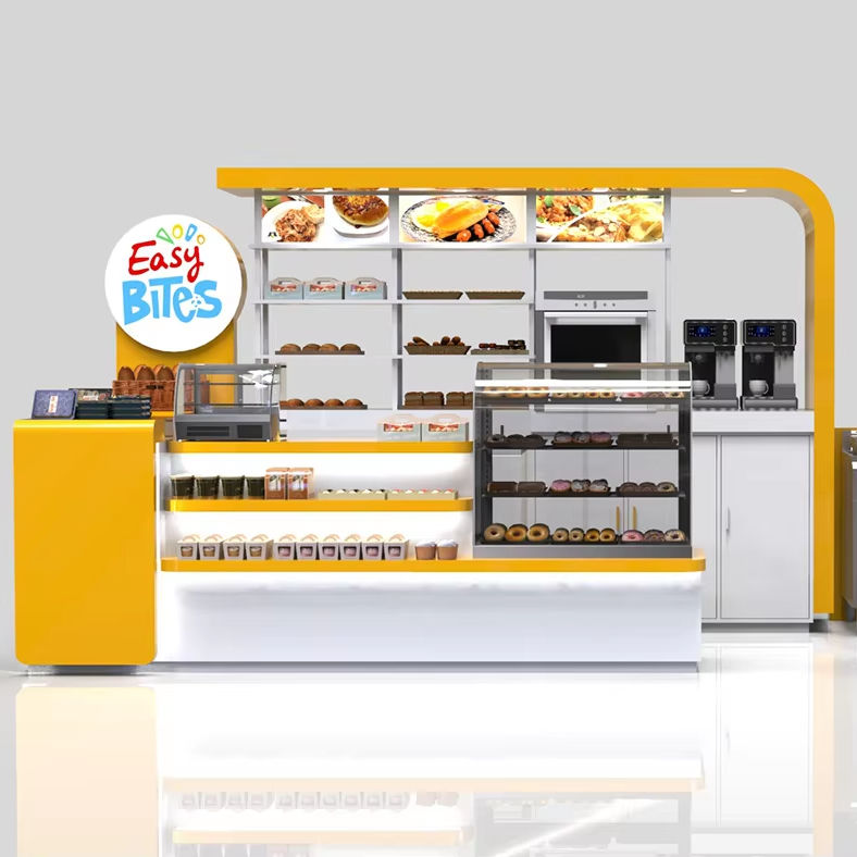 ซุ้มขายโดนัทคุณภาพสูง สีเหลืองและสีขาว พร้อมตู้โชว์โดนัทภายใน สำหรับขาย