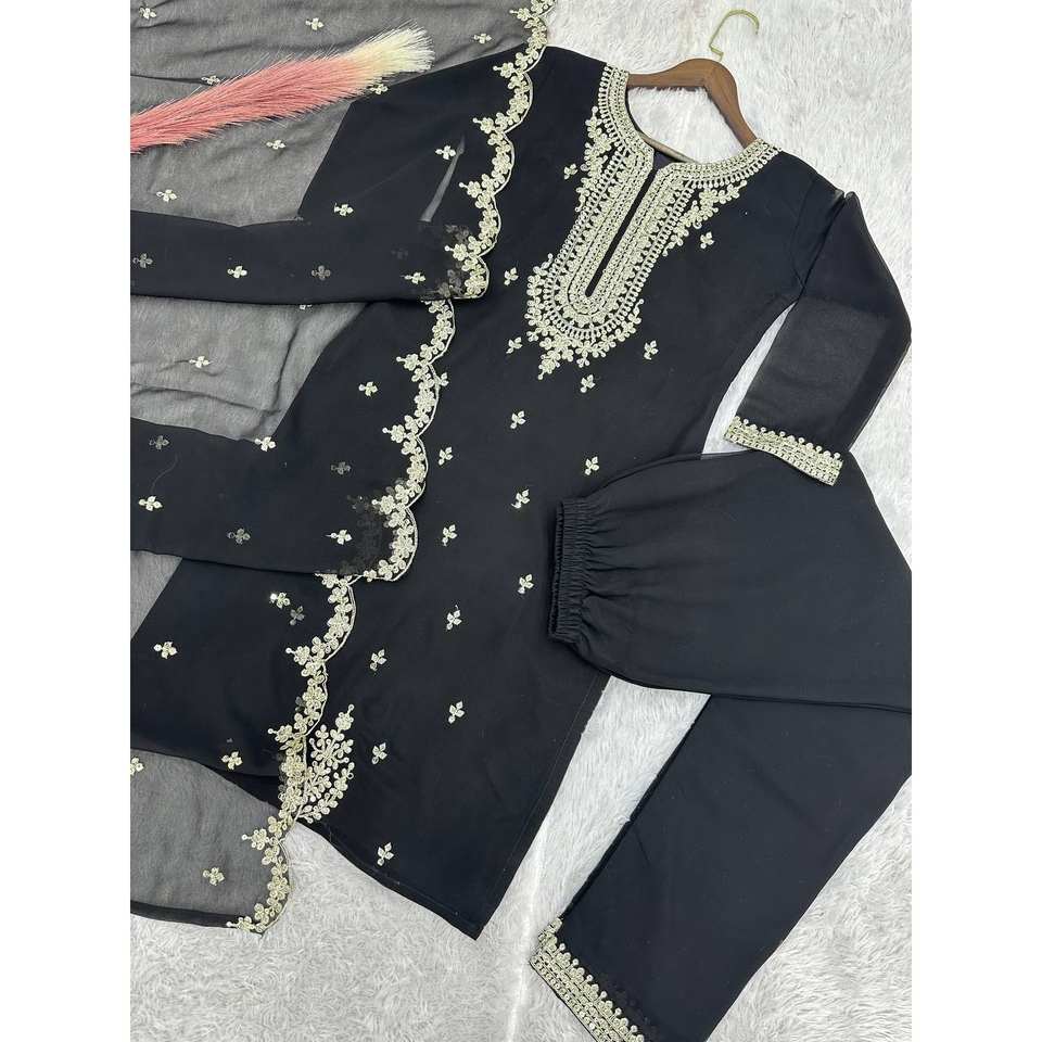 ชุดสูทผู้หญิงสีดำ HK แบบเสื้อ-กางเกง-ผ้าคลุมไหล่ พร้อมงานปักและประดับด้วยดิ้นและเลื่อม ไซส์ M