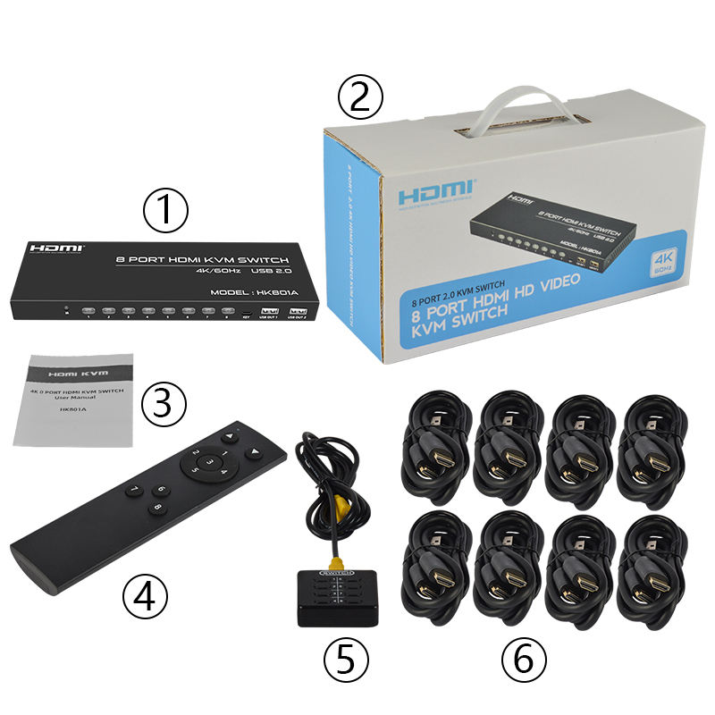 สวิตช์ KVM HK801A Fjgear คุณภาพสูง 8 พอร์ต HDMI2.0 ตัวเลือก USB2.0 8 เข้า 1 ออก 3840X2160P*60Hz 4K HDMI สวิตช์ KVM อัตโนมัติ