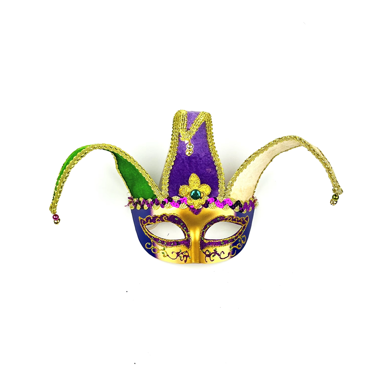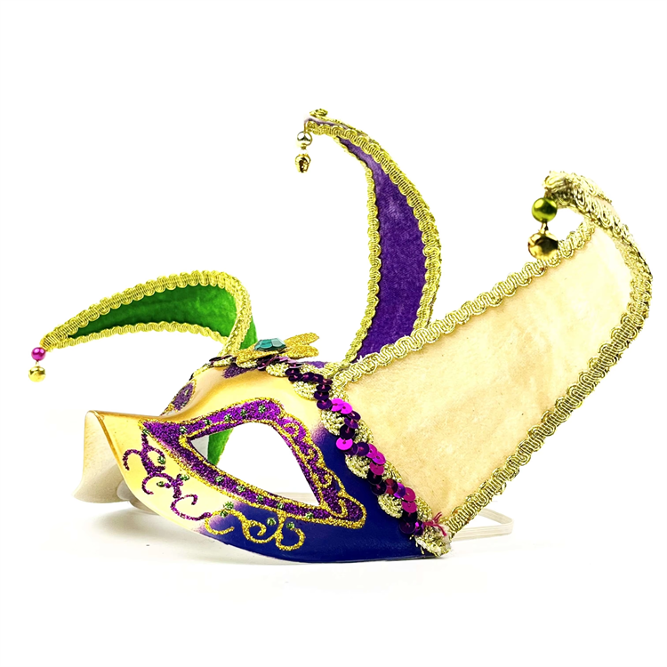 หน้ากาก HLC ODM มาร์ดิกราส์ จอลลี่ โจ๊กเกอร์ พร้อมป้าย FDL สีทอง เขียว ม่วง พร้อมกระดิ่งเล็กๆ สำหรับงานพาเหรด งานคาร์นิวัล งานปาร์ตี้สวมหน้ากาก