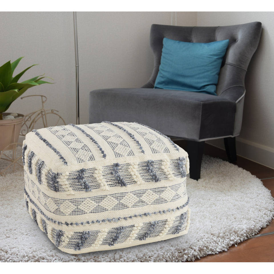 HMS 18\" Blue Striped Pouf Ottoman Antiqued Rattan Wood Bench with Modern Design for Home Bedroom Living Room Storage Feature