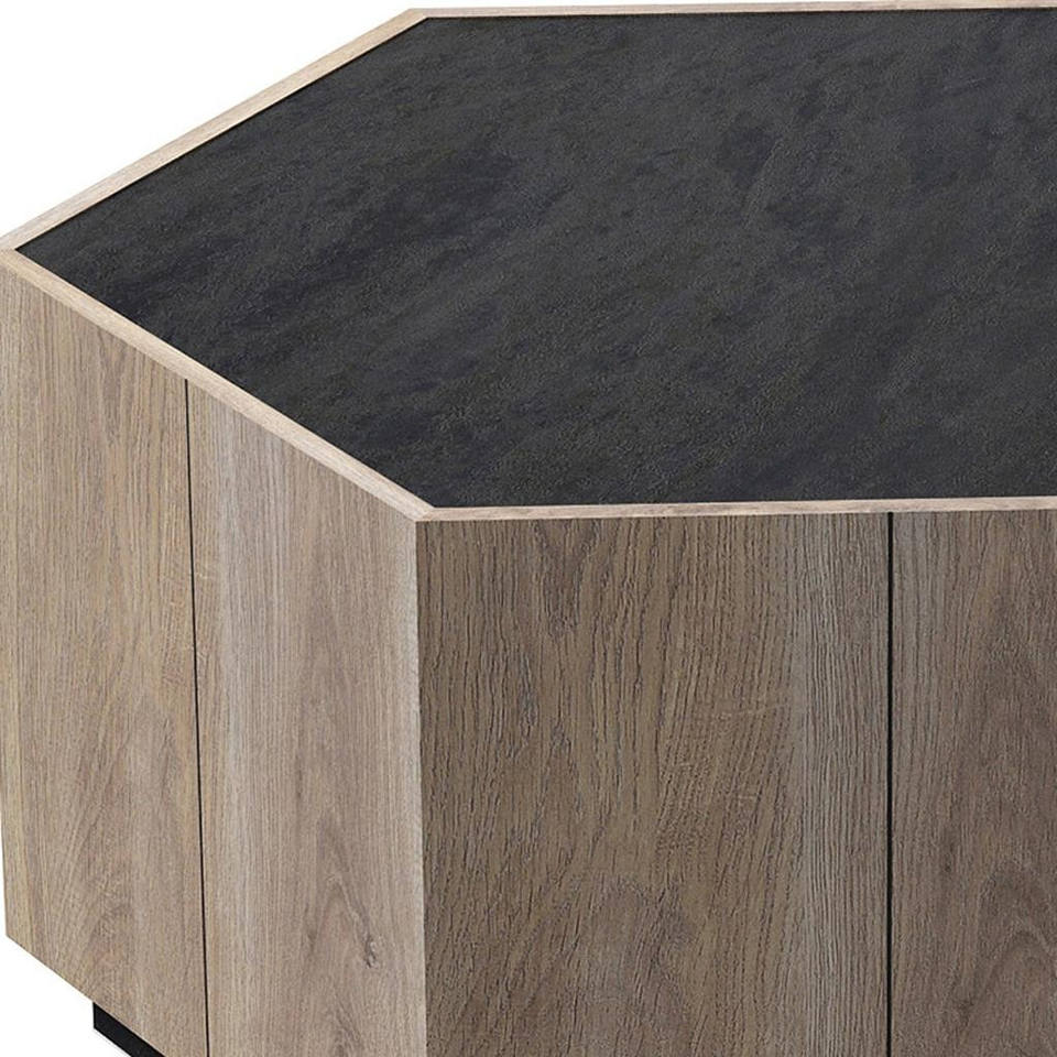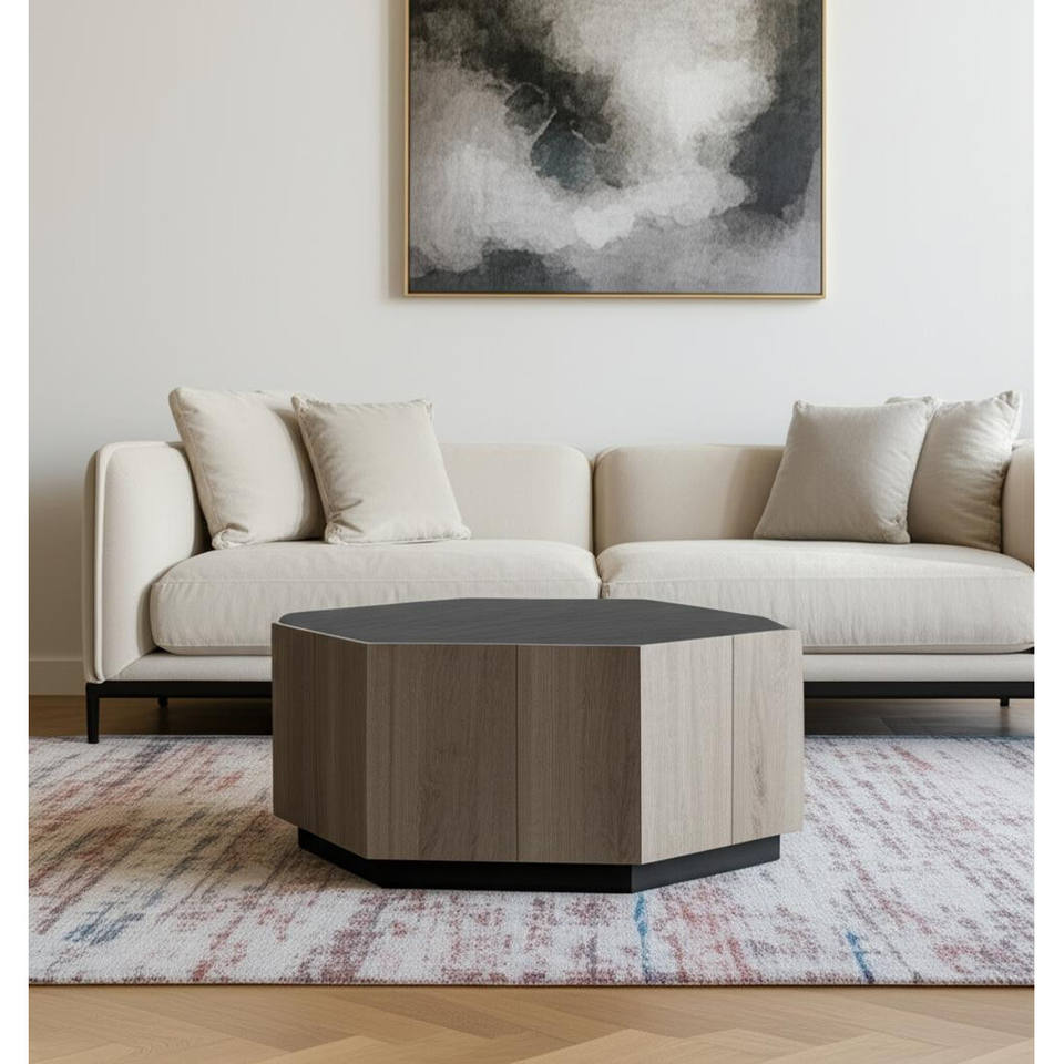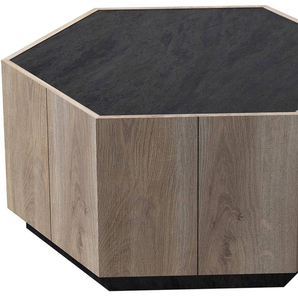 HMS 32\" Durable Black and Oak Wood Hexagon Coffee Table with Two Drawers Scandinavian Style Living Room Furniture Set