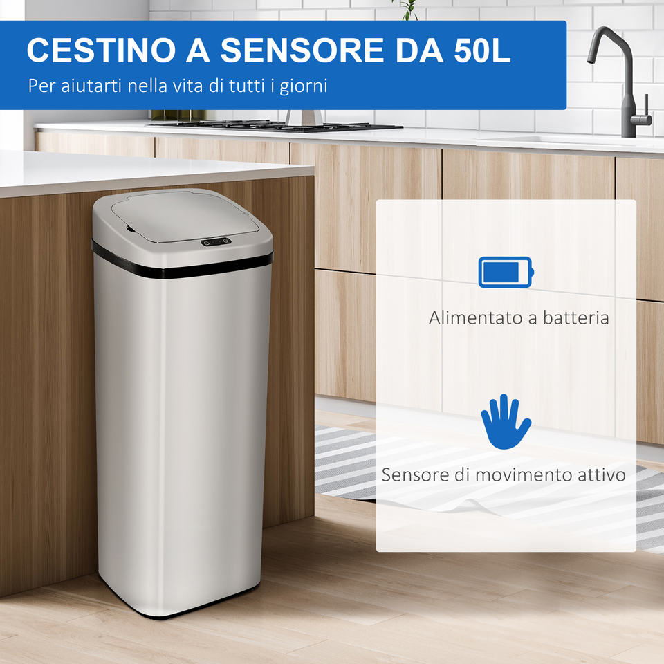 Homcom ถังขยะเปิดอัตโนมัติเซ็นเซอร์อินฟราเรดทำจากสแตนเลส50L เงิน
