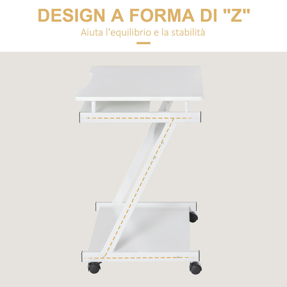 Homcom โต๊ะคอมพิวเตอร์คลาสสิกและประหยัดพื้นที่ถาดคีย์บอร์ดแบบพับเก็บได้4ล้อและชั้นล่าง60x48x73cm สีขาว