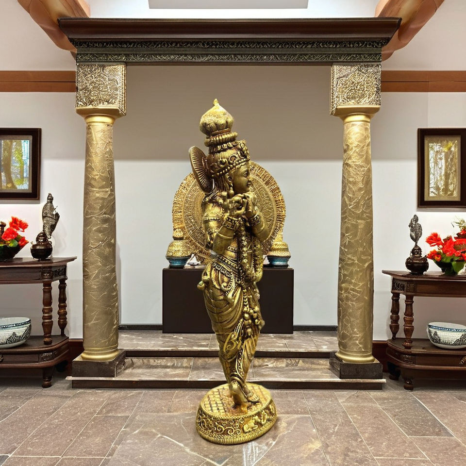 โฮมจีนี งานฝีมือ รูปปั้นคริสนา ศิลปะป๊อปอาร์ต ทำจากทองเหลืองชุบทอง งานศิลปะสไตล์อาร์ตเดโค รูปปั้นตั้งพื้น กำลังเล่นขลุ่ย ทนทาน เหมาะสำหรับตกแต่งทางเดิน