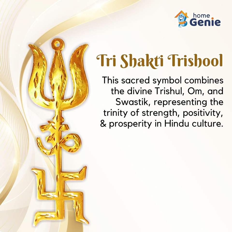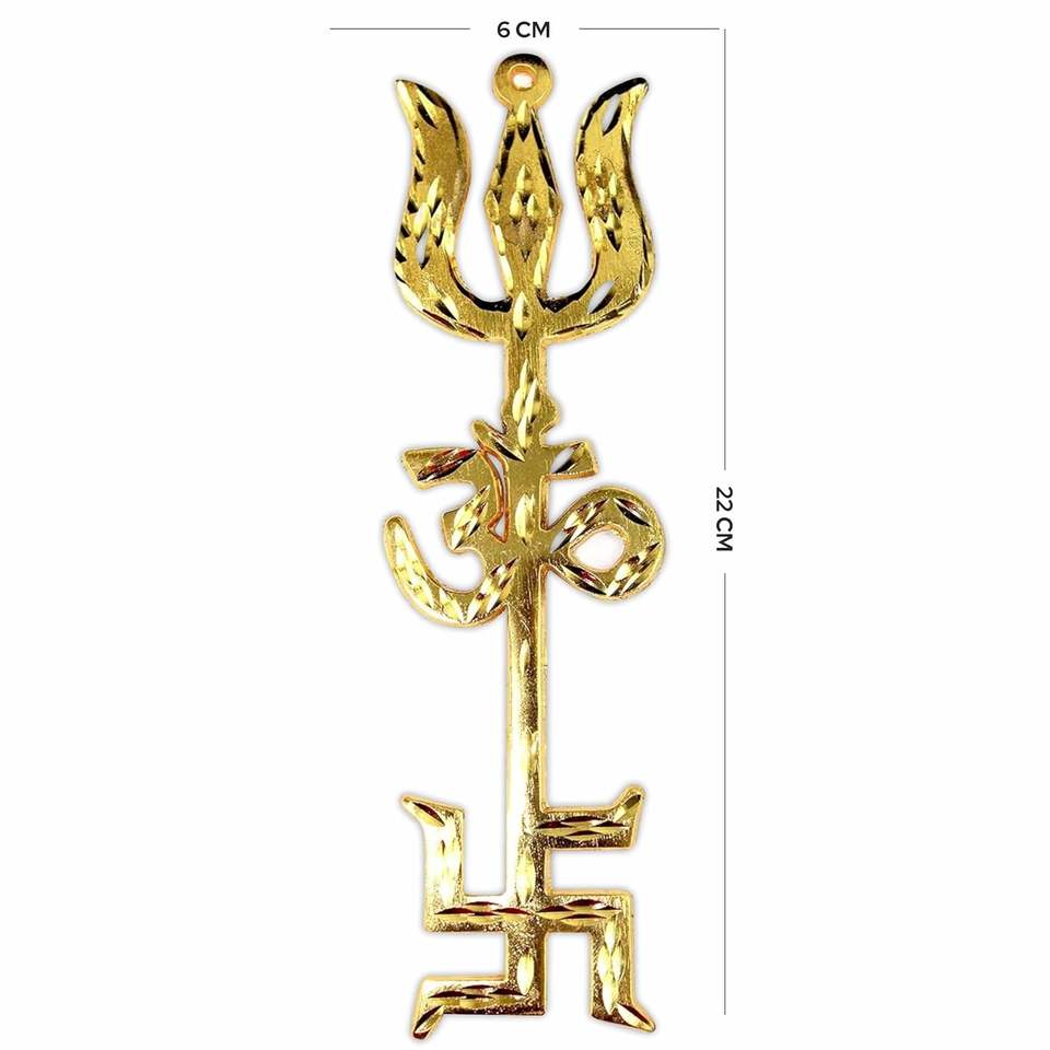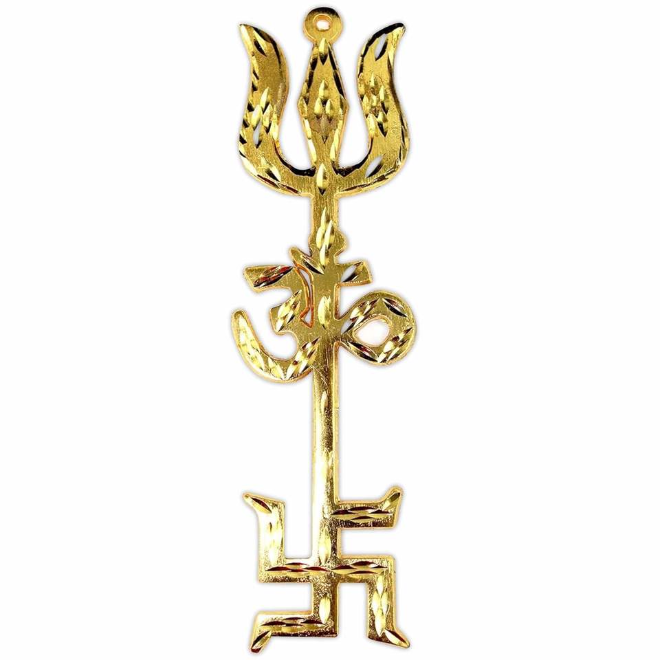 สัญลักษณ์บ้านจีนี่ไตร Shakti trishool ทองเหลือง, OM, และ swastik สำหรับวัดบ้าน, Vastu และการป้องกันทางจิตวิญญาณ